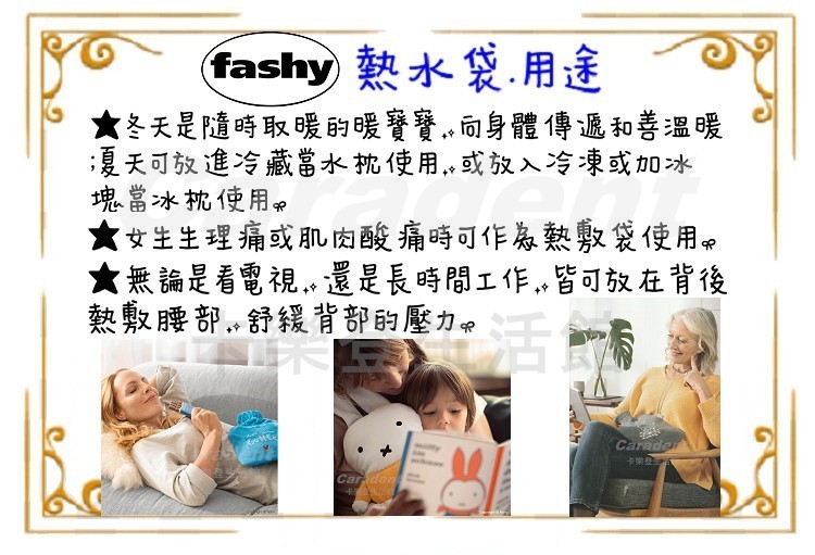 不分季節均可使用,冬天當暖暖包,夏天當冰枕,熱水袋亦可熱敷,舒緩肌肉痠痛或女生生理期痛。